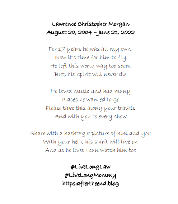 When people ask me who I’m going with, I tell them I’m going with Lawrence. He will be with me and he will be proud. I will live large because he can’t. I know he will be proud of me, after all, “live long mommy” was a direct order.